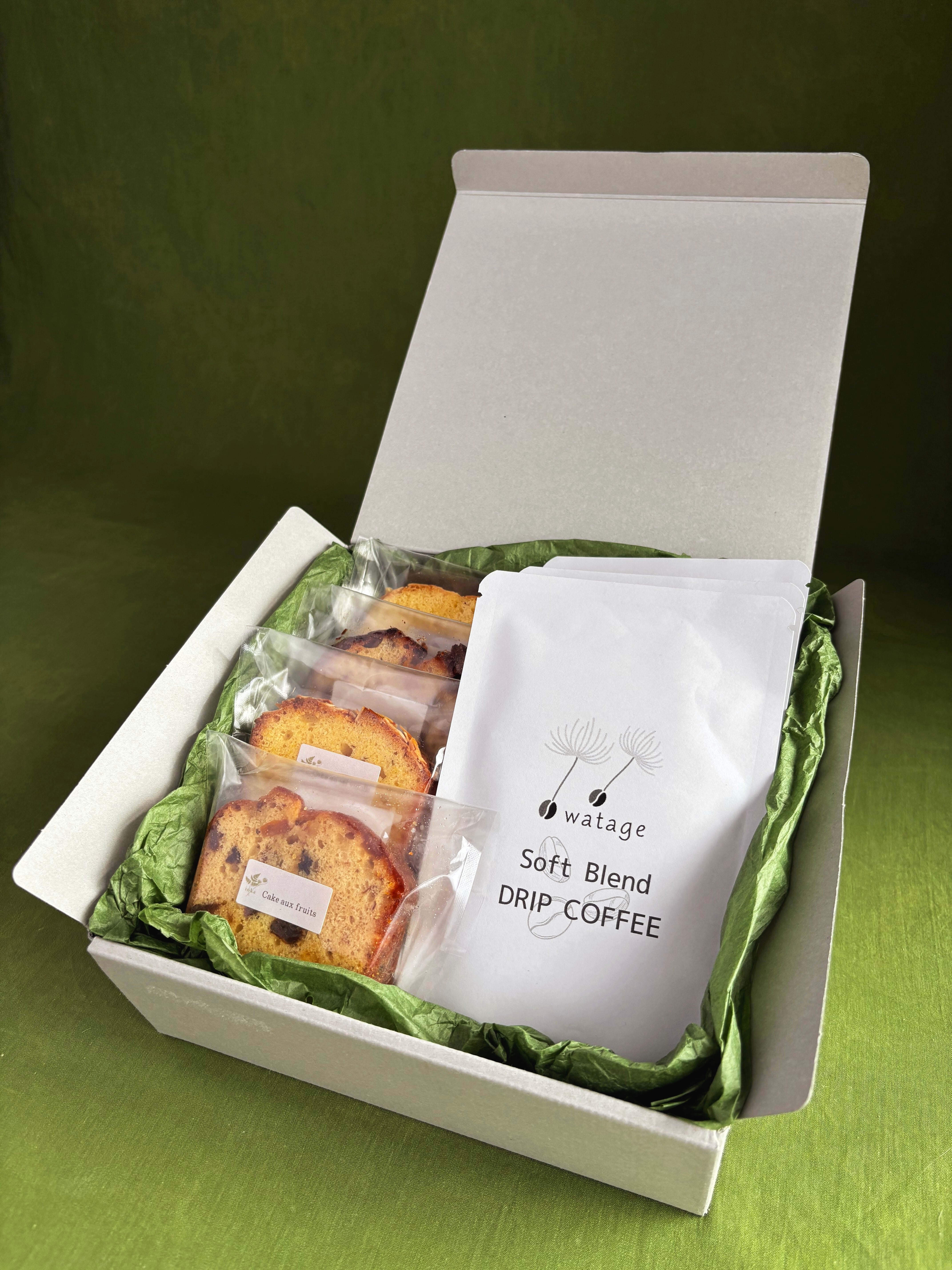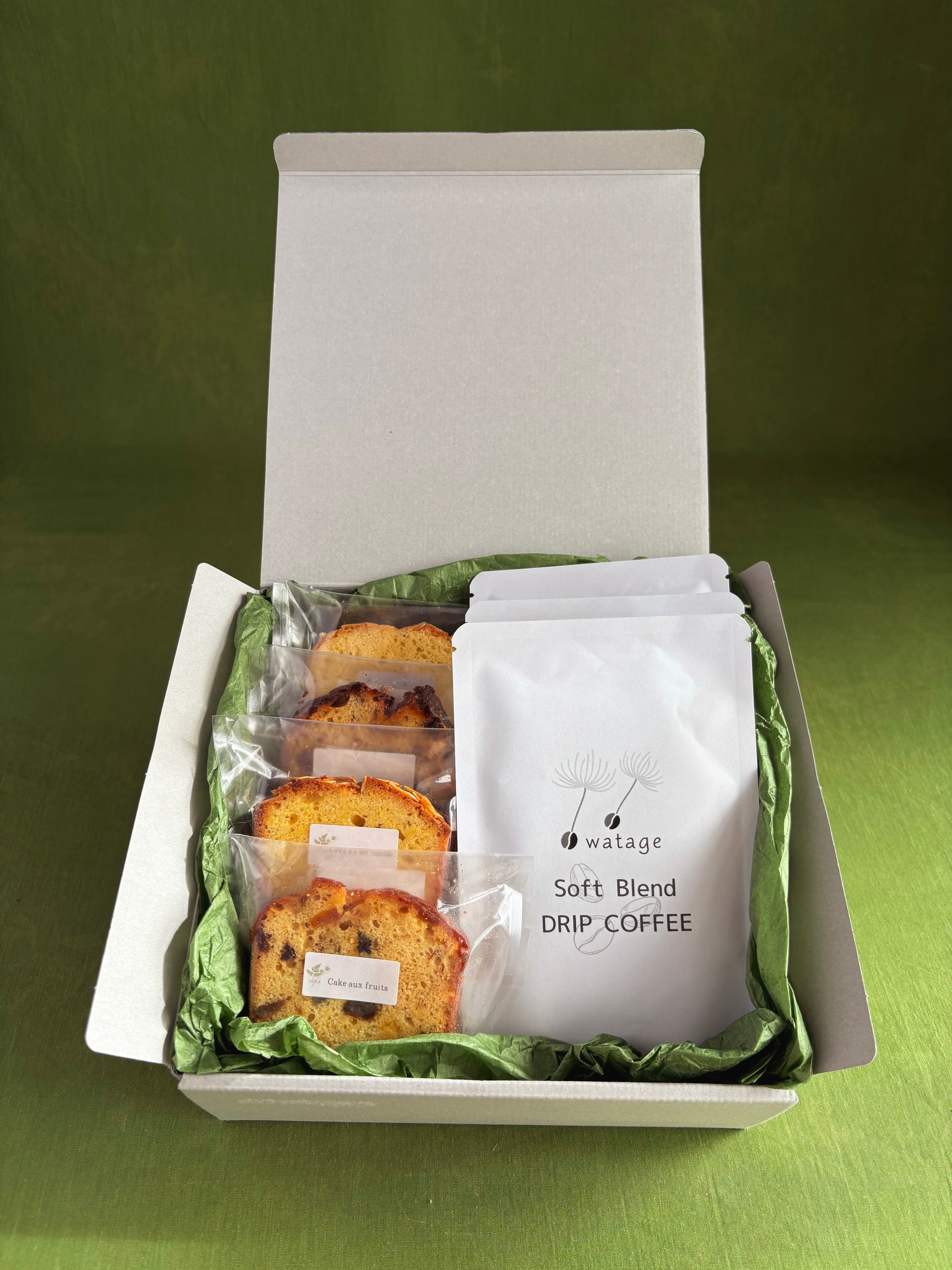 綿毛珈琲のドリップバッグ1種と隠花のケーク2種を詰め合わせたギフトセットです。