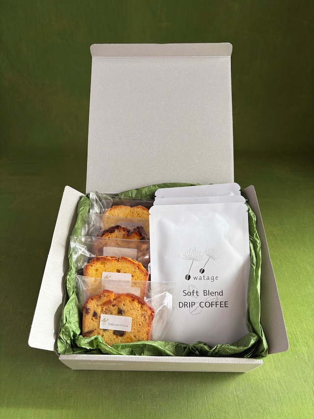 -コーヒーと焼き菓子のギフト- 綿毛珈琲のコーヒー2種と隠花のケーク2種を詰め合わせたギフトセットです。 コーヒーは豆or粉またはドリップバッグの3パターンよりお選びいただけます。 別れと出会いの足音が近づいて来ました。 ふわふわ風に乗って、様々な場所で芽吹く植物たち。 あるいは、休眠期で長い眠りに入る植物たち。 様々な節目の季節がやってきます。 変化の大きな季節は、思いがけず疲れが出ることも。 大切な方のほっと一息のそのそばに、綿毛珈琲と隠花が寄り添えますように。 ○内容 焼き菓子 【cake au sel vanille-ケーク オ セル ヴァニーユ-】 3個 マイルドで香り豊かなブルボン種、濃厚でスパイシーな香りの希少なタヒチ種、2種類のバニラビーンズを使用したシンプルなケークです。 フランス産の塩とアーモンドスライスの香ばしさがよいアクセントに。 『原材料』 バター(国内製造)、卵、砂糖、小麦粉、アーモンドパウダー、アーモンドスライス、バニラビーンズ、塩 (一部に小麦・乳成分・卵・アーモンドを含む)/ベーキングパウダー(アルミフリー) 【cake aux fruits-ケーク オ フリュイ-】3個 ドライフルーツや愛媛県産柑橘ピールなどをラム酒漬けにし、たっぷりと使用した、ほんのりラム酒香る大人のケークです。 『原材料』 ドライフルーツ(レーズン(トルコ産)・イチヂク・プルーン・アプリコット・レモン・ラム酒)、砂糖、小麦粉、卵、バター(一部に小麦・乳成分・卵を含む)/ベーキングパウダー(アルミフリー) コーヒー 【Soft Blend】 香り華やぐ飲みやすさ重視ブレンド 酸味のない飲みやすいブレンドコーヒー。 まろやかな風味と心地よい口あたりが特徴で、後味スッキリです。 コーヒーの後味が残るのが苦手、冷めてもおいしく飲みたい方にもおススメです。 商品詳細 *風味特性: スパイス、シトラス、優しい甘さ、後味スッキリ *焙煎度: 中煎り *内容量: 100gまたはドリップバッグ3袋(1袋あたり10g入) 【Dawn Blend】 しっかりとコーヒーを感じながらも後味スッキリブレンド 早朝の空が明るくなり始める頃を意味する"Dawn" 薄暗く静かな空が徐々に明るく晴れ渡っていくようなイメージをコーヒーで表現しました。 目が覚めるようなコーヒー感を出しながらも、心地よく澄んだ後味が広がるブレンドです。 商品詳細 *風味特性: フローラル、優しいコク、後味スッキリ *焙煎度: 中深煎り *内容量: 100gまたはドリップバッグ3袋(1袋10g入) ○賞味期限 *焼き菓子 発送日より2週間 *コーヒー 焙煎日より1ヶ月 ○保存方法 直射日光、高温多湿を避け保存してください ※配送は冷蔵クール便でのお届けです。 ※ご注文日から1ヶ月先まで配送日の指定が可能になります。 1ヶ月以上先の配送をご希望の方、また一度の注文で6個以上のお買い上げをご希望の方はご注文前にメール([email protected])にてご相談ください。 ※ギフトラッピング、紙袋をご希望の方はオプションよりお選びください。(+200円) ※のし紙をご希望の方は、オプションから「のし紙」をご選択下さい。 外熨斗、内熨斗どちらかお選びいただけます。